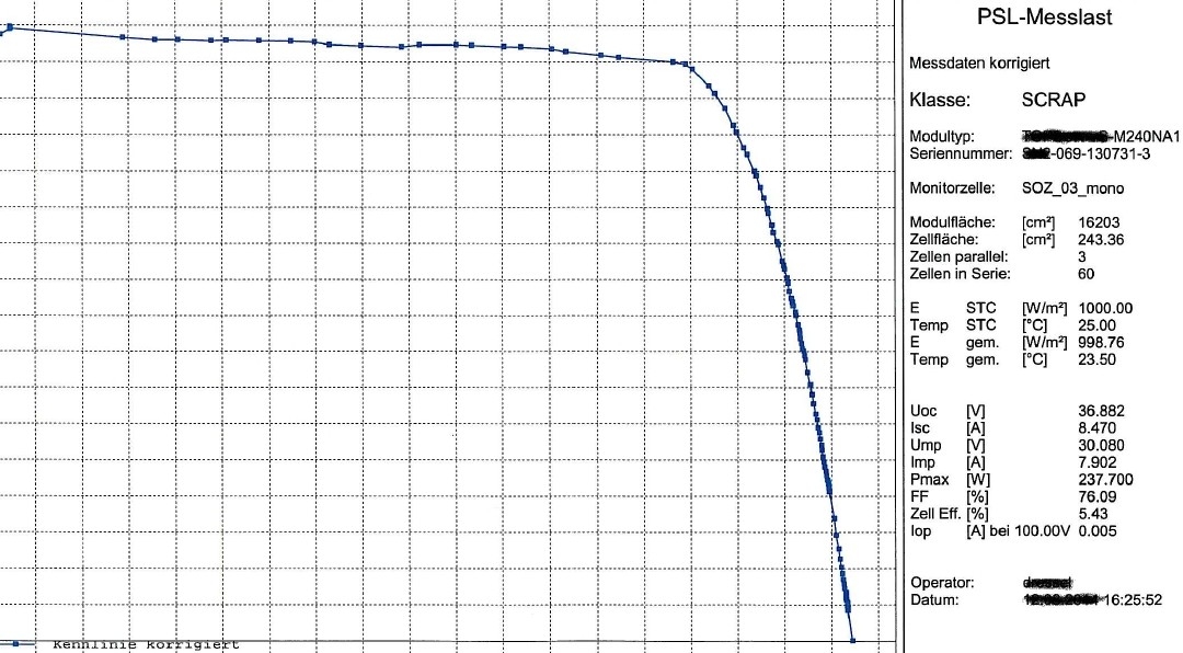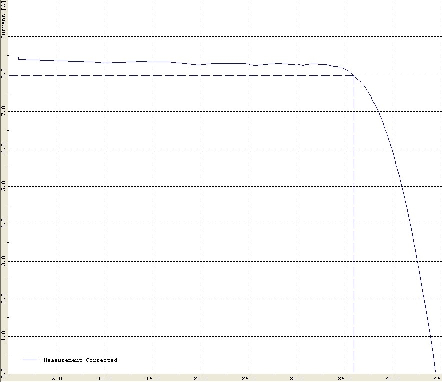 Das Ergebnis der Messung ist die Kennlinie, aus der sich die gegenwärtige, tatsächliche maximale Leistung des Moduls ermitteln lässt.